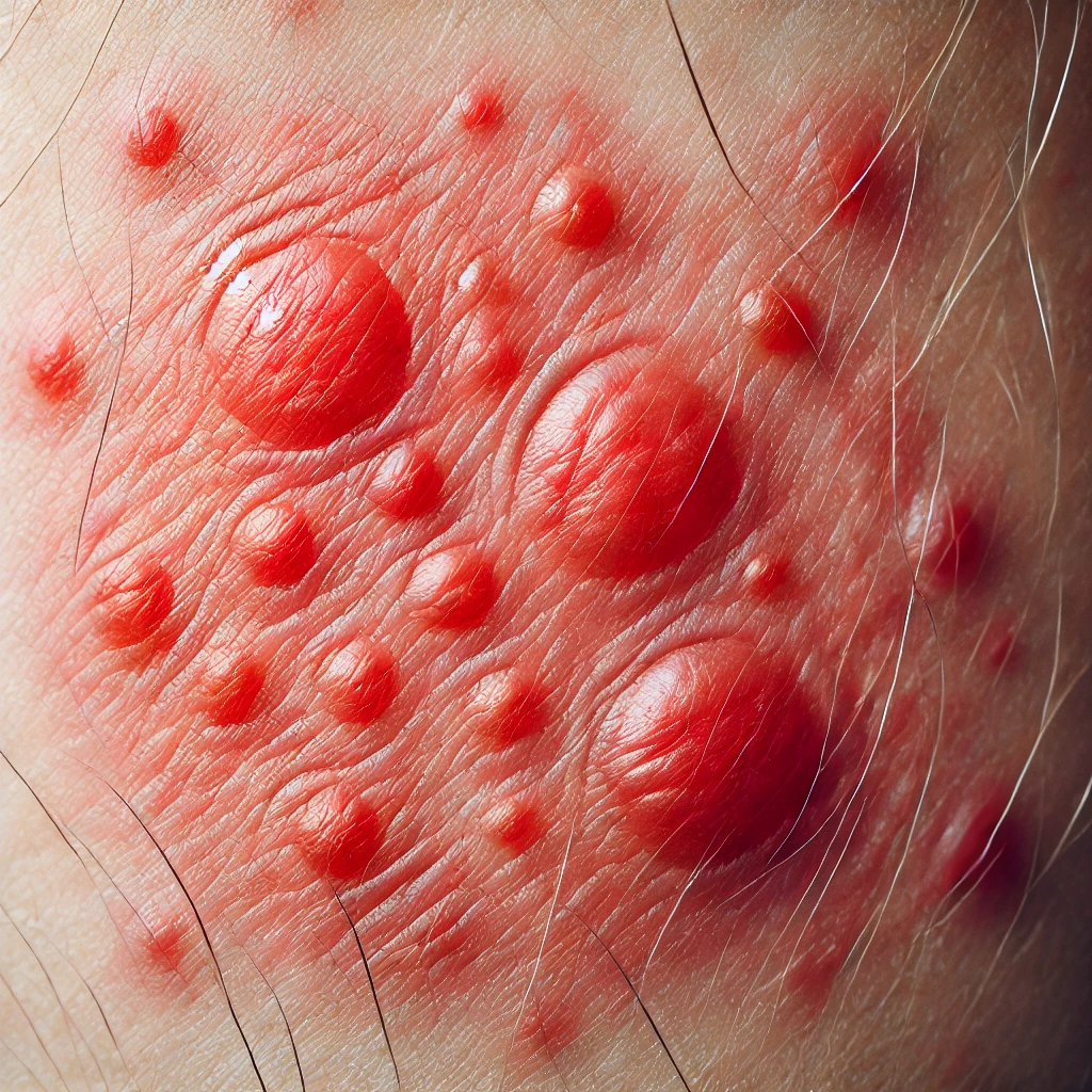 - 물집: 시간이 지나면서 붉은 반점이 물집으로 변합니다. 물집은 군집을 이루며, 투명한 액체로 가득 차 있습니다.