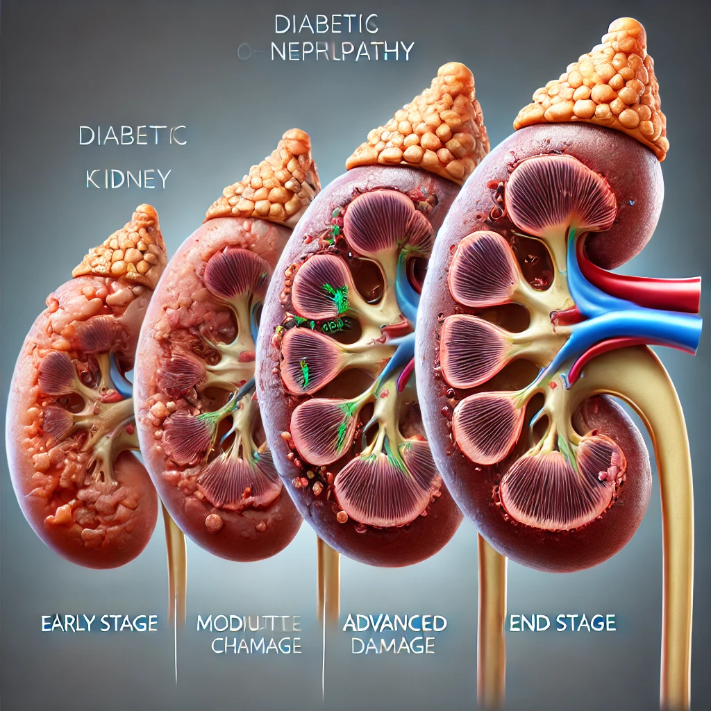 - 설명: 당뇨병성 신장병은 당뇨병 환자에게서 발생하는 신장 합병증입니다. 고혈당 상태가 지속되면 신장의 여과 기능이 손상되어 신장 기능이 점차 저하됩니다.