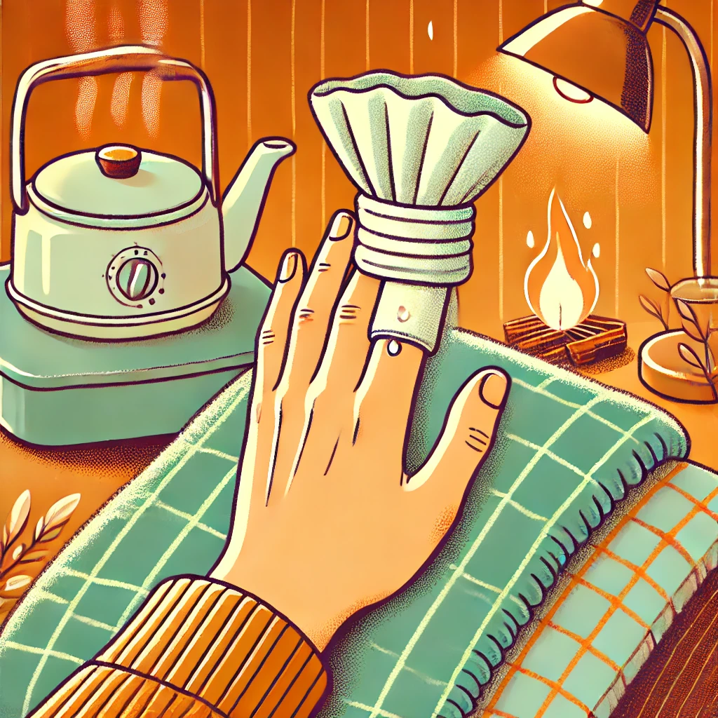 - 방법: 따뜻한 물에 수건을 적셔 짜낸 후 통증이 있는 손가락 마디에 감싸거나, 전기 온열 패드를 사용합니다. 온수욕도 좋은 방법이 될 수 있습니다.