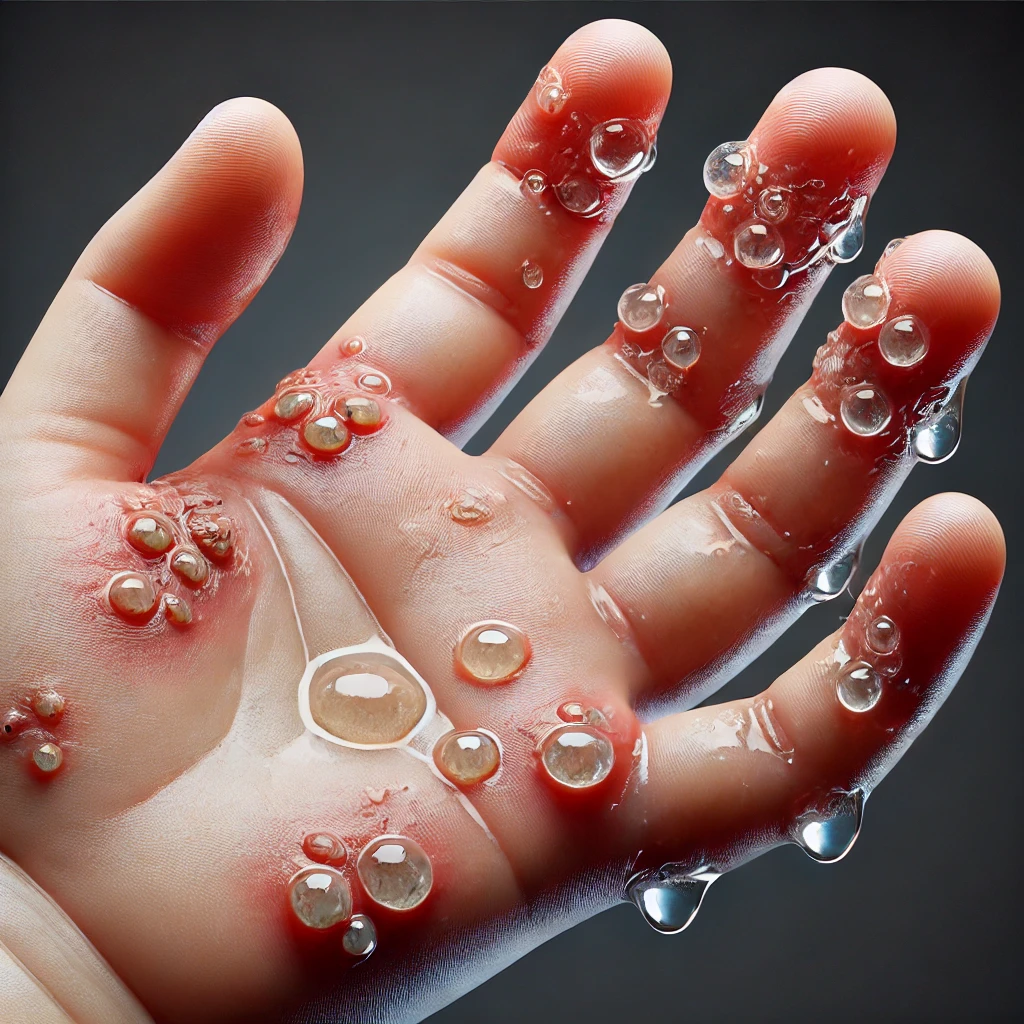 손가락 습진이 더 심해지면 작은 물집이나 수포가 생길 수 있습니다. 이러한 수포는 터지면서 삼출물이 나오기도 하며, 이는 감염의 위험을 높일 수 있습니다. 삼출물은 피부 표면에 남아 피부를 더욱 민감하게 만들고 추가적인 염증 반응을 유발할 수 있습니다.
