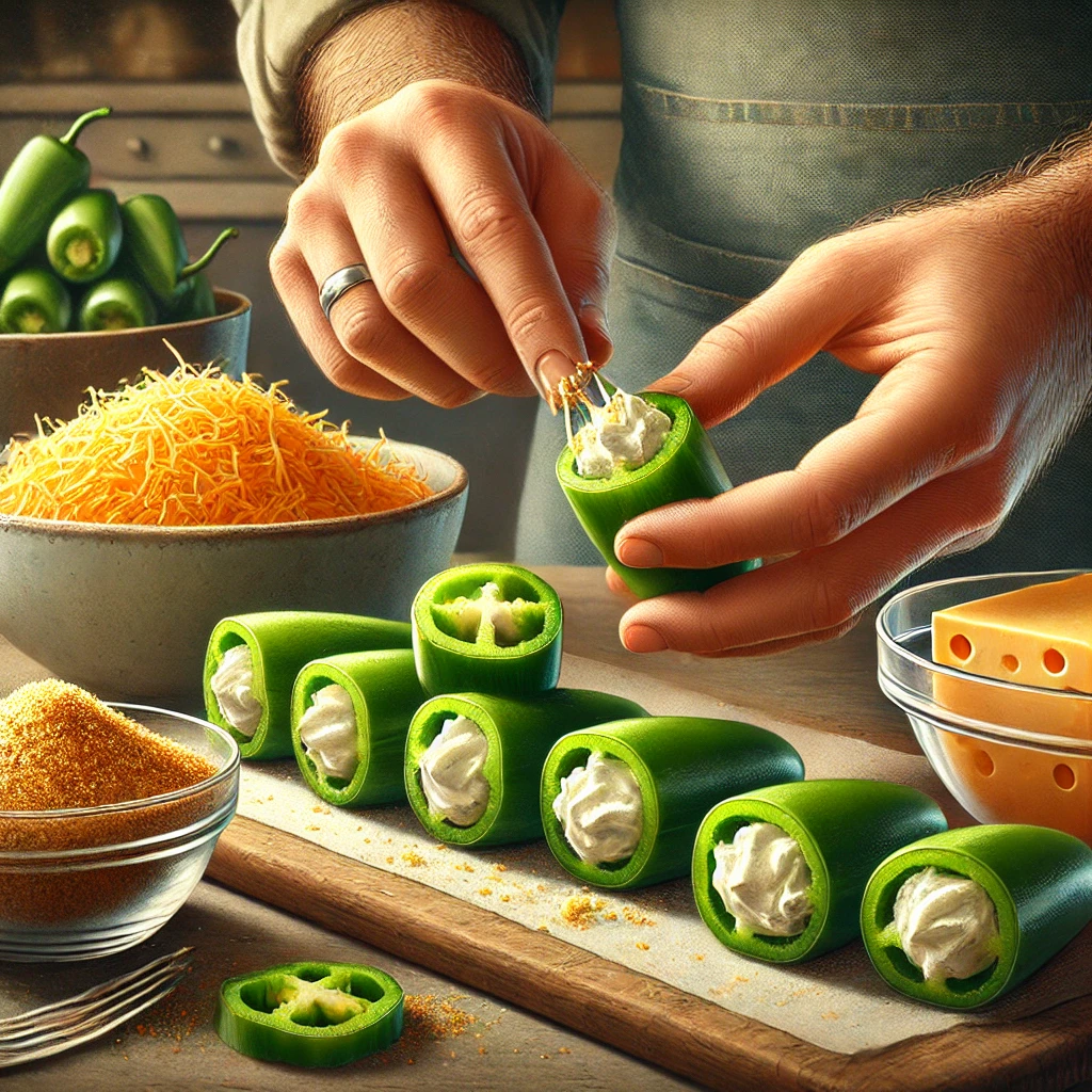 3. 속 채우기: 준비한 할라피뇨에 치즈 혼합물을 가득 채웁니다.